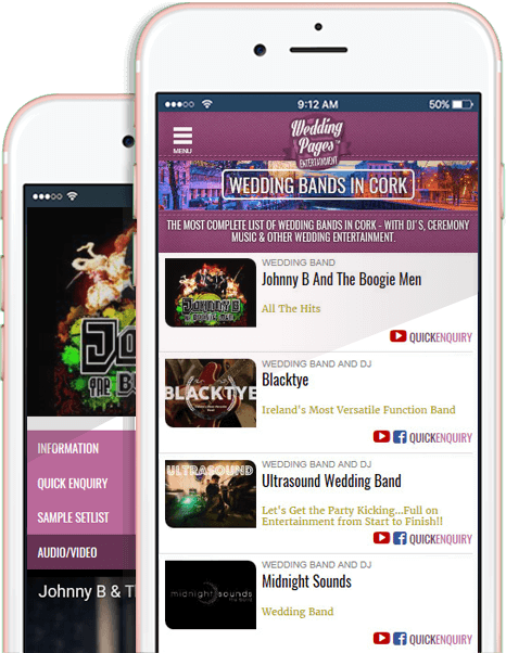 We are Ireland's only website dedicated to finding & listing EVERY Wedding Band, DJ & Entertainer in the country. Inside you'll see videos, photos, setlists, live Facebook updates, phone, website and email links - you can even enquire directly with the bands right there on their page..